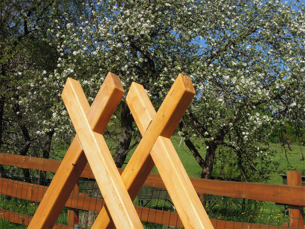 Díky předchozímu postupu jsem měl finálně opracované nohy podpěr a chyběl již jen jeden detail. Tesařsky je spojit, aby byly obě nohy v jedné rovině a držely pohromadě v požadovaném úhlu. Z chytrého zdroje jsem zjistil, že se tomu říká přeplátování. A jak na něj? Bohužel jsem si v nadšení z nevšední práce nedělal fotodokumentaci, takže se budete muset spokojit se slovním popisem a nafoceným výsledkem.
