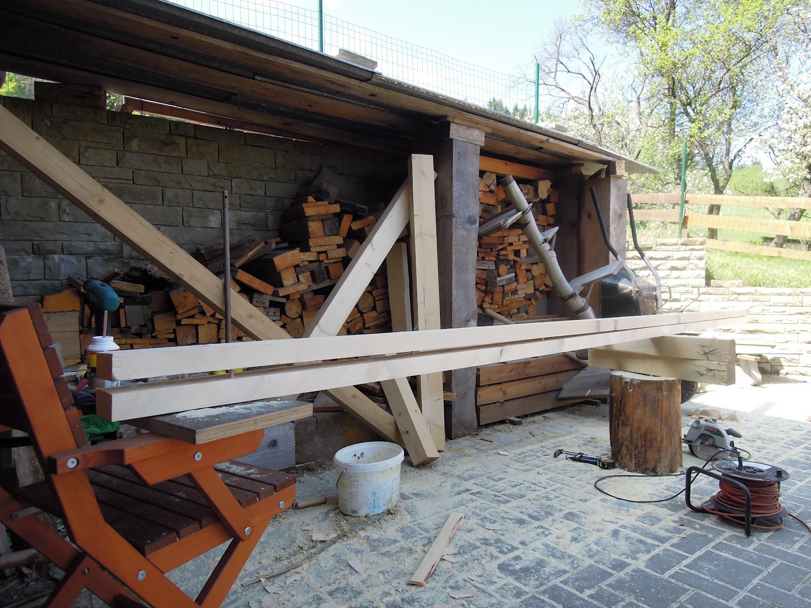 Během plánováni jsem zjistil, že budu potřebovat minimálně 4 m dlouhý trám na překlad. Jenže takový mezi mými zbytky již bohužel nebyl a kupovat se mi ho nechtělo. Naštěstí jsem našel 4 m dlouhou fošnu 20x4cm, ze které ten překlad lehce vyrobím. Stačí rozříznout na půlku a slepit na sebe. Alespoň se budu moci vychloubat, že mám na překlad použitý lepený profil. On ale nakonec ten lepený profil bude výhodnější, protože nebude mít tendence k prohýbání se a praskání.