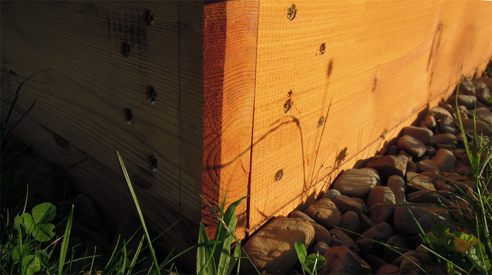 Když konečně očekávaná silná návštěva přijela, přenesli jsme kostru pískoviště a usadili doprostřed zahloubené díry. Vyšlo to akorát tak, že vyčnívala pouze horní deska. Ideální! Důležitá byla volba okraje kolem pískoviště. Nejjednodušší by bylo díru zase přisypat hlínou. Ale to by nebylo zrovna prospěšné pro dřevo, které by rychle hnilo. Nakonec to vyhrál pás 10cm oblázků, které zbyly ze stavby.
