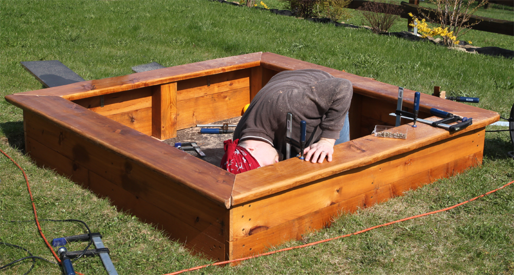 Proto jsem zvolil přidělání pomocí úhelníků a to z vnitřní strany pískoviště. Ty jsou patrné až při pokleknutí a podrobnějším zkoumání.