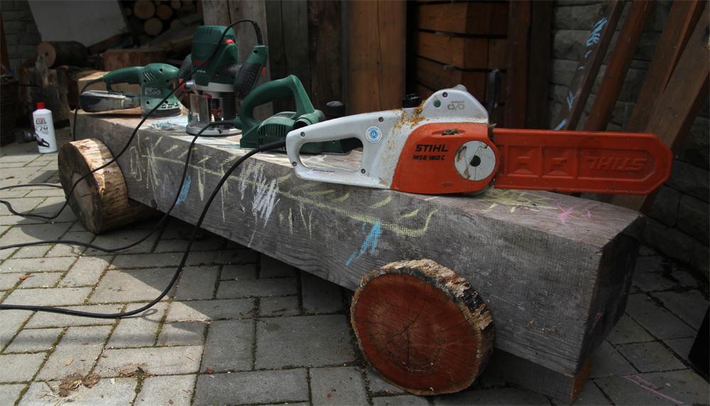 | Nářadí připravené k postupnému se vystřídání na trámu. |
