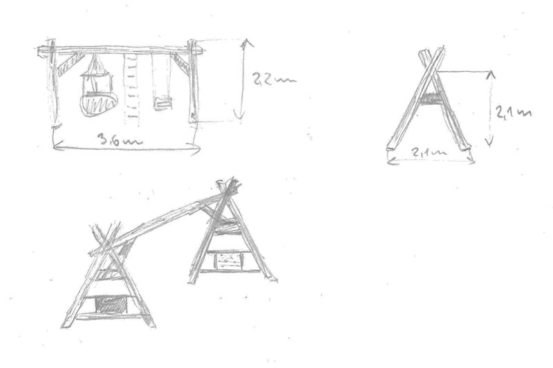 V kostce: dvě podpěry z trámků zkřížených na čep, vyztužení podpěr ve výšce (aby mohlo projít děcko pod nimi), vyztužení zavětrováním, trámkový překlad s možností navrtat uchycení houpadel.