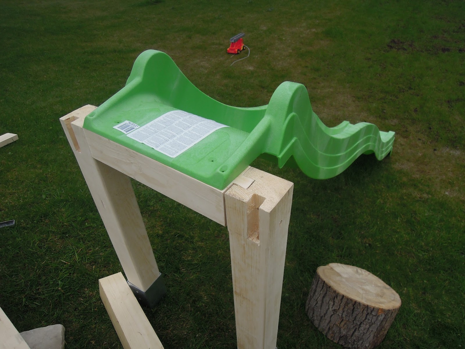 Jako první jsme se vrhli na přední nohy, které budou držet samotnou skluzavku. Nejdříve vyměřit, jak budou potřeba vysoké. Díky svahu, na kterém budou umístěné stačila výška 85 cm. A jak je spojit spolu a se zbytkem nástupní plošiny? Byly k dispozici celkem solidní "vinkle", nicméně pod to bych se asi asi nepodepsal. Takže nezbývá, než oživit tesařské spoje a začít čmárat.