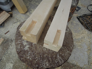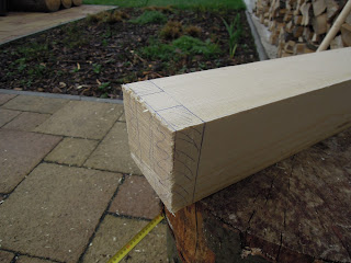 Čepy byly malinko náročnější zejména pro zadavatele, který měl na starosti ruční řezání pilou čepovkou. Z má strany jsem mu alespoň pomohl kotoučovou pilou s nastaveným potřebným průřezem přes vlákna. Doma bych si dal čep do hoblice a prořízl ho také kotoučovkou i z vrchu. V bojových podmínkách exteriéru jsem si ale na to netroufl.