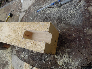 Samotné nohy potřebovaly dva dlaby. Jeden jsem udělal centrovaně (3 cm od okraje, 3 cm dlab a 3 cm k okraji). Ten druhý jsem raději kousek posunul, aby zůstal vršek potřebně pevný a neodštípl se. Takže vyšlo cca 2 cm od okraje, 3 cm dlab a 4 cm ke kraji.