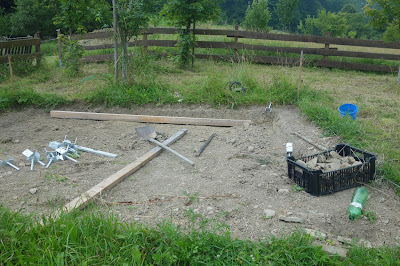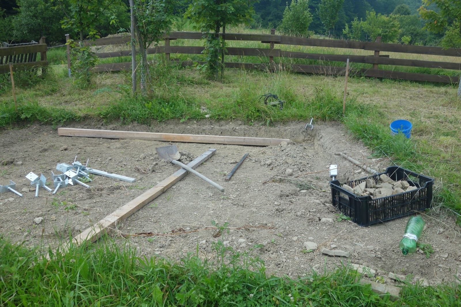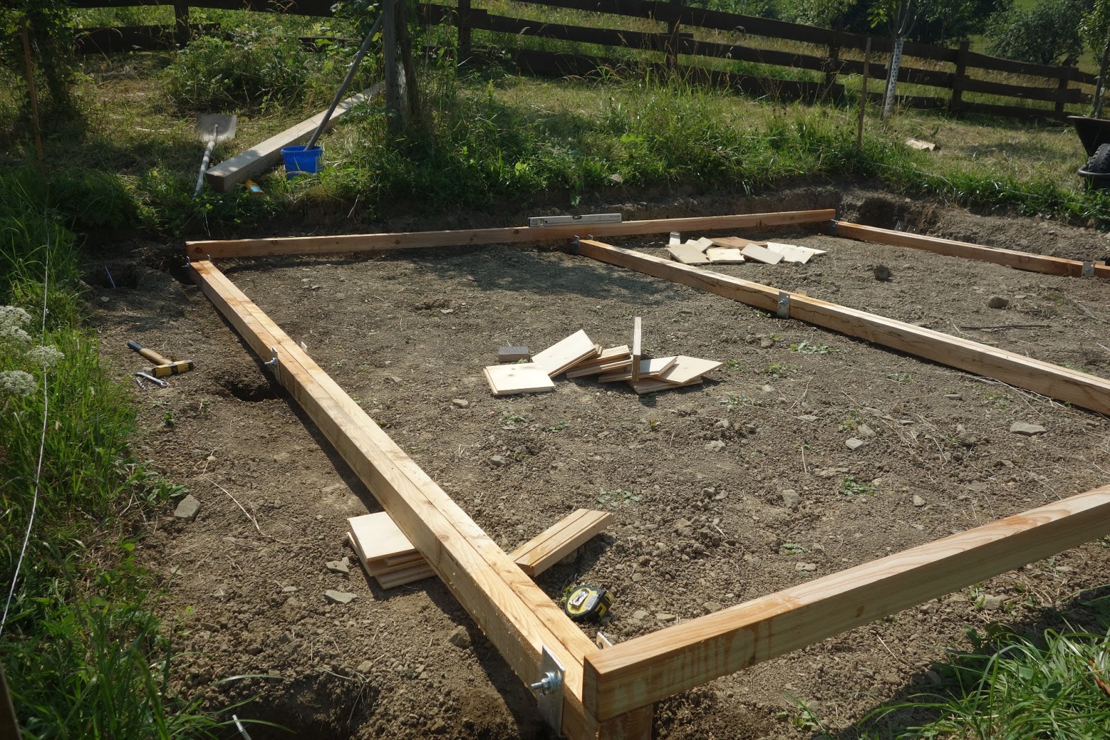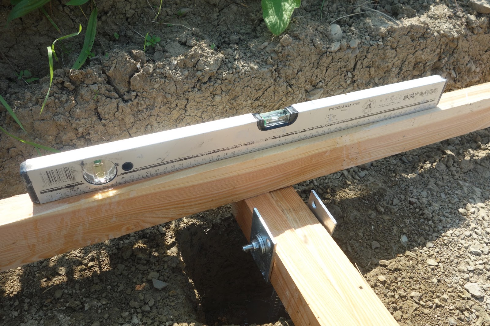 Když jsme měli hotové základní rozvržení, bylo snadné vše dát do stavu, kdy bylo možné betonovat patky již napevno. Nejdříve jsme zkontrolovali úhlopříčky pro zajištění kolmostí stěn. Potom jsme vyrovnali vše do vodováhy (nosné trámky s minimálním sklonem pro zajištění odtékání dešťové vody). Na potřebných místech jsme podložili trámky destičkami. Patky se tak dostaly přesně na místo, kde následně byly potřeba. Stačilo zasypat a zalít vodou.